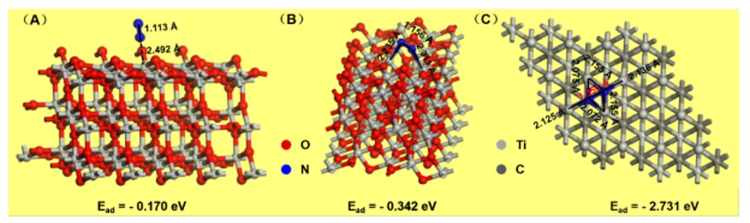 Schematics of slab model after relaxation for N2@5-fold-Ti (A) and N2@4-fold-Ti (B). (C) Schematics of slab model after relaxation for N2@Ti3C2 MXenes