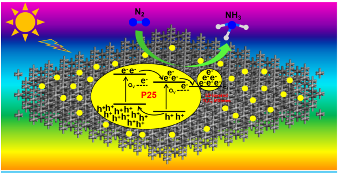 Schematic illustration for the promotion effect of 2D-layered Ti3C2 MXenes on P25 for photocatalytic NH3 synthesis from N2 molecular