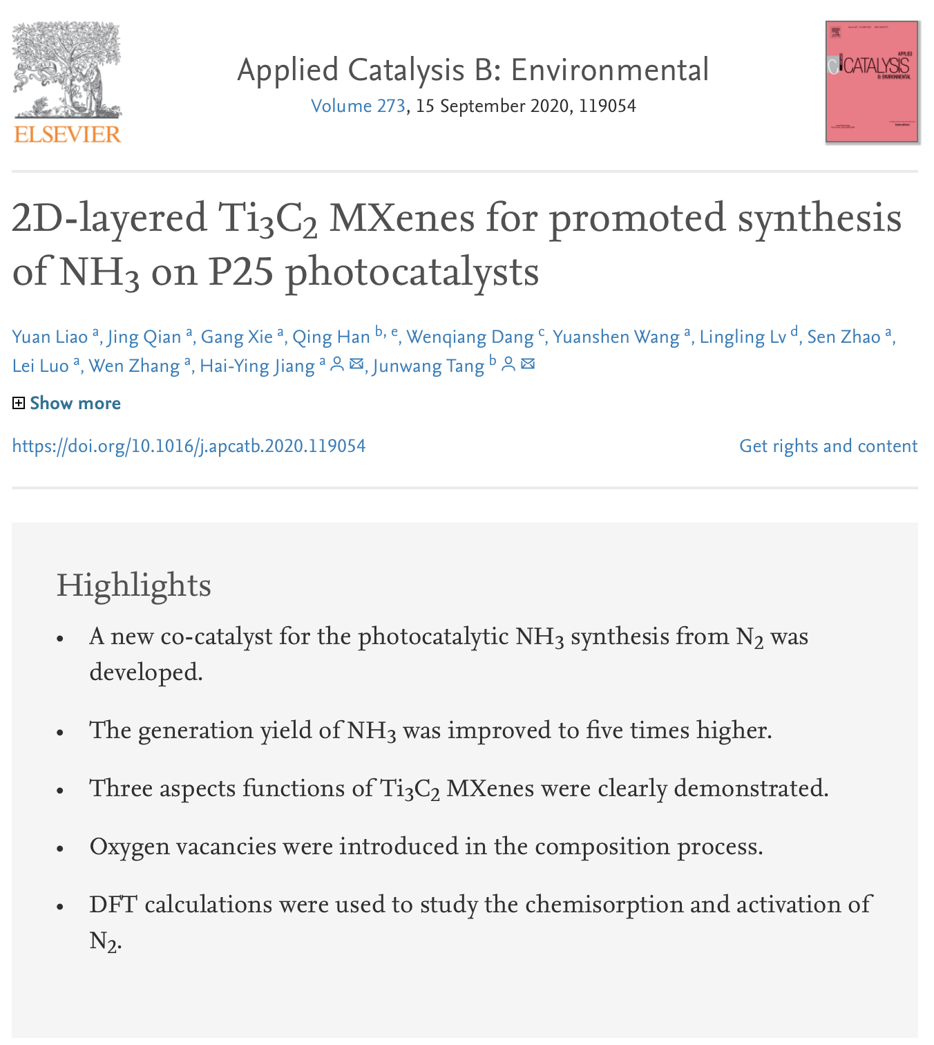 近日,能源与催化研究中心在Applied Catalysis B: Environmental(《应用催化B-环境》)上发表了题为“2D-layered Ti3C2 MXenes for promoted synthesis of NH3 on P25 photocatalysts”的研究论文。