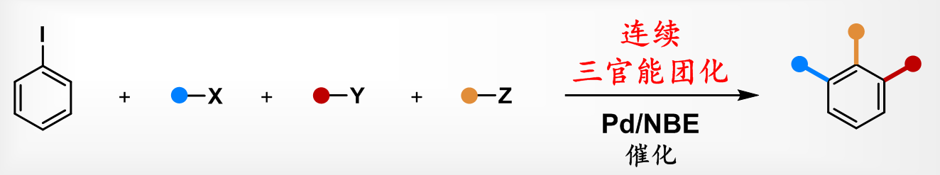 芳烃官能团化是合成化学的核心技术手段,广泛应用于医药、农药、日用化学品、功能材料等诸多领域。亲电芳香取代、钯催化交叉偶联(获2010年诺贝尔化学奖)、催化碳氢键活化等反应,在其中起到了举足轻重的作用。然而,这些传统方法仅局限于芳烃单个或多个位点的单一官能团化转化。相比而言,芳烃多位点的连续官能团化仍是合成化学领域的难点问题,相关研究至今还停滞在双官能团化阶段。栾新军课题组引入“一石三鸟”的全新策略,采用钯/降冰片烯协同催化,首次实现了碘苯类芳烃的连续三官能团化。