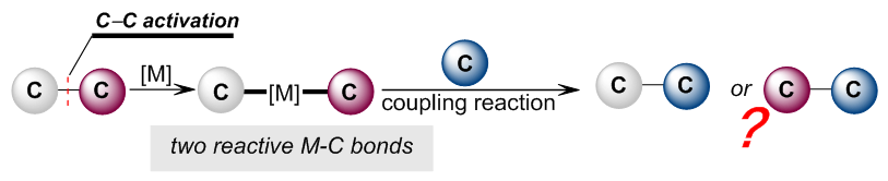 酮类结构是许多天然分子和生物活性分子中不可缺少的结构单元,也是化学合成研究中重要的反应基团,因此,酮类化合物的高效转化一直是化学家关注的重点。过渡金属催化的碳—碳活化策略近些年在酮类化合物的转化中已经取得了不错进展,但依旧存在一些亟待解决的关键问题:1. 过渡金属对羰基碳—碳键氧化加成会产生两种不同活性的碳—金属键,实现这两种键的选择性反应仍然面临巨大挑战;2. 酰基金属中间体存在可逆的羰基脱除与插入过程,而这也对两种碳—金属键活性的调整带来了困难。