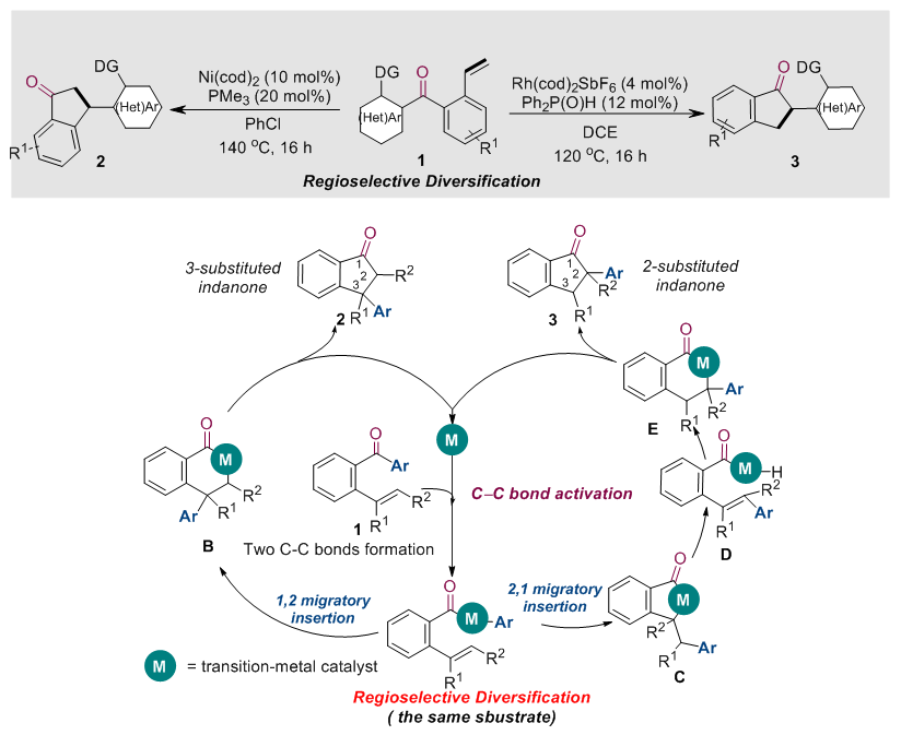 基于过渡金属催化剂在碳‒‒金属键选择性偶联中出色的调控能力,该课题组进一步探索了催化剂控制的羰基转化策略在烯烃碳酰化反应中的应用。他们采用含有末端烯烃的吲哚酮衍生物为底物,通过合理的金属催化剂选择,成功实现了催化剂控制的烯烃区域选择性碳酰化。该课题组发现,当采用Ni(cod)2为催化剂时,酰基—金属中间体会与烯烃发生1,2-迁移插入,得到3位芳基取代的茚满酮;而当催化剂调整为Rh(cod)2SbF6时,酰基—金属中间体与烯烃插入的区域选择性发生了改变,通过2,1-迁移插入最终得到了2位芳基取代的茚满酮。该工作通过催化剂控制的区域选择性反应成功实现了吲哚酮类化合物向茚满酮类骨架的多样性转化,为取代茚满酮的制备提供了一种高原子经济性的新方法(CCS Chem. 2020, 10.31635/ccschem.020.202000448)。