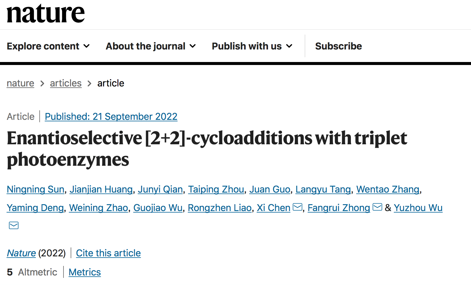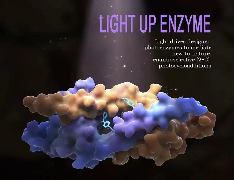 2022年9月21日,西北大学化学与材料科学学院陈希教授与华中科技大学吴钰周教授,钟芳锐教授合作,在Nature主刊在线发表文章“Enantioselective [2+2]-cycloadditions with triplet photoenzymes”,原文链接:https://www.nature.com/articles/s41586-022-05342-4。这项工作是酶催化光化学领域的关键性突破。他们将三线态能量转移这一典型的光催化模式整合到蛋白质中,通过基因重新编程,将功能改性的非天然氨基酸插入蛋白质,创造出含有三线态光敏剂的人工光酶,成功催化吲哚衍生物的分子内[2+2]光激发环加成反应,并且可以实现利用人工光酶与底物分子立体化学的非共价键相互作用控制反应过程[2+2]光激发环加成反应过程中的对映体选择性,实现高达99%e.e对映体选择性。陈希教授团队解析了该人工光酶与底物的复合体晶体结构,揭示了超分子蛋白质腔中的人工三线态光酶能量转移反应活性极大提高和催化高度空间立体选择性的机制:在疏水性蛋白质空腔内,通过π-π堆积作用,光能从非天然氨基酸传导到底物,激活反应。底物和周边氨基酸残基的弱相互作用决定了产物单一手性构象。这项研究工作将化学光敏剂与蛋白质结构相结合,创造了新型“三重态光酶”,丰富了光驱动生物催化的功能和应用范围。同时实现高手性控制,为医药、农药、信息和材料领域的发展提供核心技术支持。