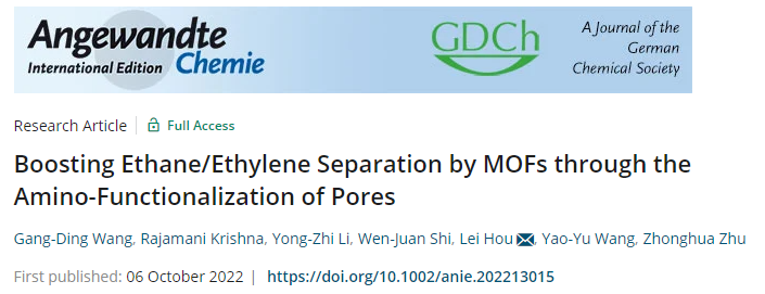 乙烯(C2H4)是石化行业需求量最大的原料,2021年全球产量超过2.1亿吨。乙烯主要由乙烷(C2H6)热分解和化石燃料蒸汽裂解产生,产物中含有少量的乙烷杂质。低温蒸馏是工业上分离乙烯/乙烷最常用的技术,但由于两种气体的沸点和分子尺寸非常接近,该技术需要大型蒸馏塔设备和低温、高压条件。因此,亟需开发新型节能的分离技术以满足工业上对聚合级乙烯的应用需求。基于多孔材料的吸附分离技术能够大大提高分离效率。