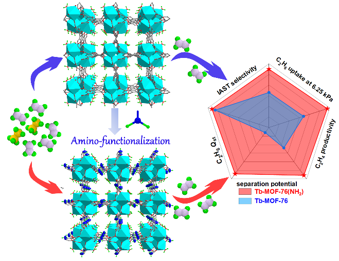 针对乙烯/乙烷分离这一难题,近日我院侯磊教授、王尧宇教授等人基于网状化学原理,通过采用一种氨基功能化的孔工程策略,设计了具有氨基基团修饰的乙烷选择性MOF(Tb-MOF-76(NH2))材料。氨基的引入有效地优化了Tb-MOF-76(NH2)的孔环境,与Tb-MOF-76相比,Tb-MOF-76(NH2)具有更窄的孔尺寸(7.2 × 7.2 Å2 vs 7.9 × 7.9 Å2)以及丰富的氨基吸附位点,表现出提高的乙烯、乙烷吸附容量以及乙烷/乙烯选择性(2.1 vs 1.7)。