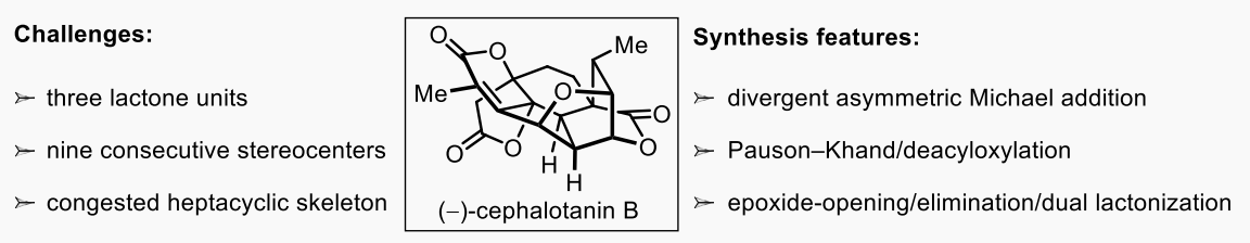 三尖杉萜家族因其突出的生物学特性和独特的分子结构而受到有机合成化学家的广泛关注。近年来,西北大学胡向东课题组基于所发展的桥环张力与缩醛位阻协同调控的立体选择性Pauson–Khand反应策略完成了含有环庚三烯酮结构的(+)-3-deoxyfortalpinoid F、(+)-fortalpinoid A、(+)-cephinoid H (Angew. Chem., Int. Ed. 2021, 60, 18572) 和含有苯环结构的(–)-ceforalide B、(–)-cephanolides B–D (Org. Lett. 2022, 24, 7507) 等多种三尖杉二萜的不对称全合成。近日,胡向东课题组基于一种epoxide-opening/elimination/dual lactonization仿生合成方案,从不对称Michael加成出发,通过新颖的Pauson-Khand/deacyloxylation反应构筑核心四环骨架,再经epoxide-opening/elimination/dual lactonization实现螺旋桨型双内酯结构的构建和拥有异常拥挤七环结构和九个连续立体中心的(–)-cephalotanin B的对映选择性全合成(Angew. Chem. Int. Ed. 2023, e202312599)。