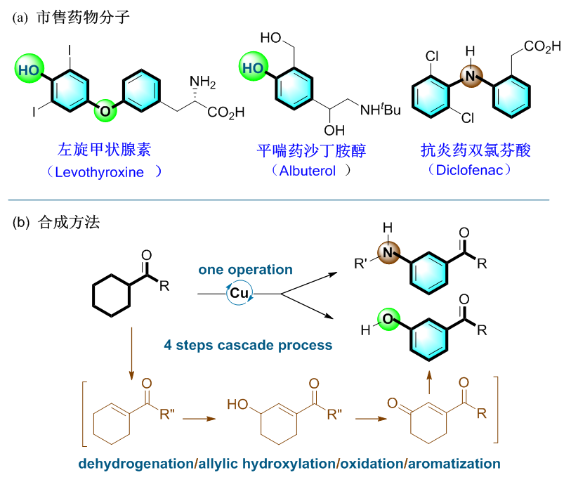 苯酚和苯胺是许多医药、农药、聚合物、染料和天然产物的核心骨架。目前,全球销量前100的药物中约25%是苯酚和苯胺类化合物及其衍生物,例如:左旋甲状腺素(Levothyroxine),平喘药沙丁胺醇(Albuterol),抗炎药双氯芬酸(Diclofenac)(图1a)。因此,如何高效地合成苯酚和苯胺一直是化学家们研究的热点。目前,合成苯酚的方法主要包括:(1)C(sp2)−H键的直接氧化;(2)过渡金属协助的C(sp2)−X键转化;(3)C(sp2)−M键的氧化。与苯酚相比,从相应的C(sp2)–H键合成苯胺往往需要经过多步或苛刻的反应条件,如,硝化、叠氮化等。在过去的一个多世纪中,三个伟大的人名反应:Ullmann−Goldberg反应,Buchwald−Hartwig反应和 Chan−Lam反应相继被开发用于生成C(sp2)-N键。这些方法已经成为基础研究和工业生成领域中制备苯胺的重要的方法。然而,这些方法往往需要使用预官能团化的芳烃,例如:卤代芳烃、类卤代芳烃、芳基硼化物等,其限制了这些方法的应用。近来,王永强课题组提出了一种从羰基取代的环己烷合成苯酚和苯胺的新策略。