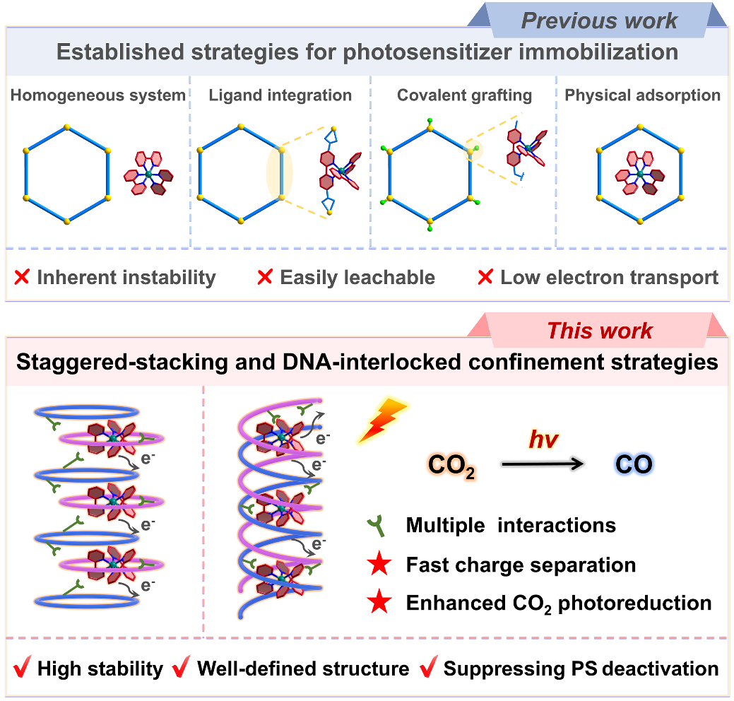 综上所述,这项工作采用错位堆叠和类DNA互锁新策略将光敏剂原位封装到MOFs中,不仅为解决非均相光催化反应中长期存在的稳定性与活性之间的矛盾问题提供了新思路,还为将不同功能分子固载到框架材料中提供了一个普适性平台,进而实现了高效的太阳能转换。