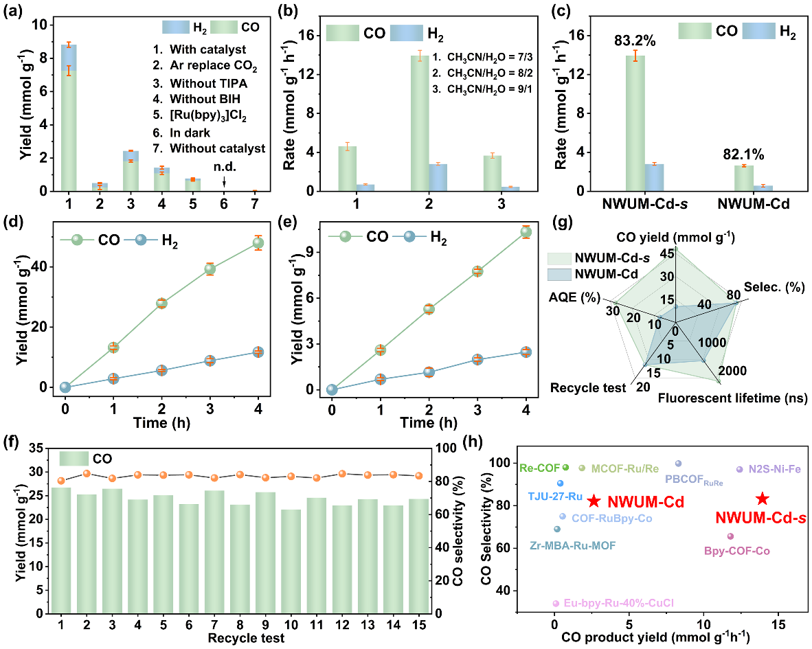研究团队通过系列光电化学性质测试表明结构的改变显著提高了电子-空穴分离能力和光生载流子的寿命;并且,以光催化CO2还原反应为模型反应,探究了NUWM-Cd-s和NUWM-Cd的光催化性能(图2)。结果表明,作为催化剂NUWM-Cd-s的CO产率为13.9 mmol g-1 h-1,是NWUM-Cd的5.3倍。更重要的是,主体MOF框架与[Ru(bpy)3]2+之间的多重弱相互作用可以有效抑制[Ru(bpy)3]2+的浸出失活。这也使两种材料表现出优异的稳定性,在长达15次的循环实验中仍然可以保持其光催化活性。