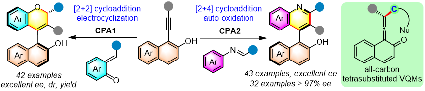 轴手性化合物存在于许多天然产物和药物活性分子之中,并且作为众多手性催化剂和配体的核心骨架广泛应用于不对称催化合成领域。近年来,有机催化在轴手性化合物合成研究中取得了快速的发展。其中,联烯醌化学引起了合成化学家们的广泛关注。然而到目前为止,该策略局限于生成基于氢原子或卤素的联烯醌中间体,其他类型亲电试剂能否与炔基萘酚形成新的联烯醌中间体并开发新的反应模式仍具有较大的挑战性。
