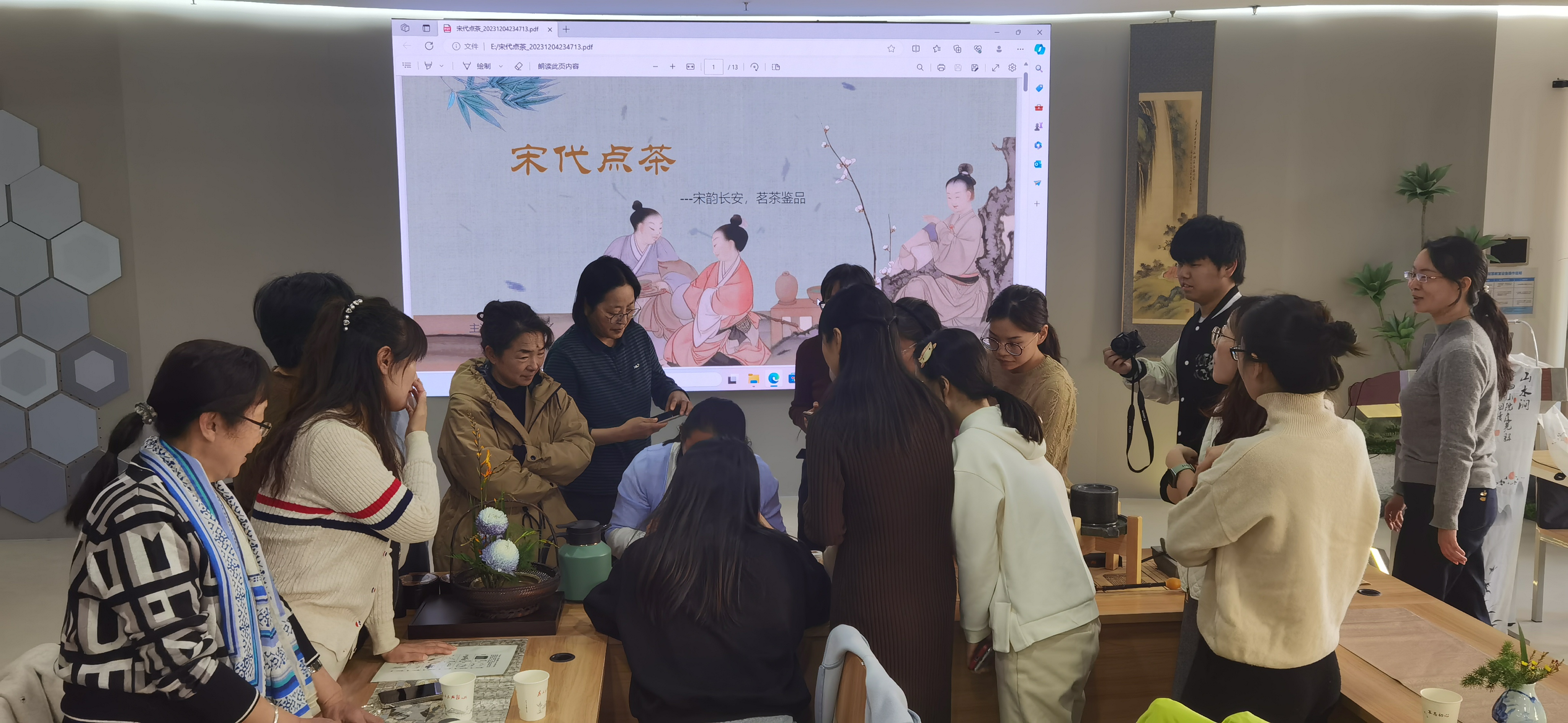 孙伟老师为大家介绍了活动举办的目的、筹备过程和后续的工作计划。伴随着悠扬舒缓的古典乐曲,齐老师引经据典,为大家讲解“宋代四艺”——点茶、焚香、插花、挂画的历史故事和基本知识,解读了宋代文化“雅”和“简”的极致之美。